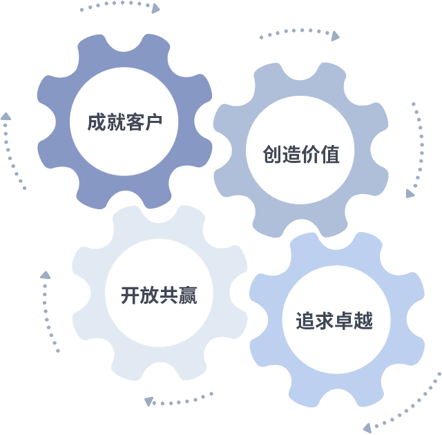 成就客户是一切决策的出发点,,,,创造价值是衡量所有工作的标准,,,,追求卓越是我们做事做人的态度,,,,开放共赢是我们的格局也是最终的结果。。。价值观的齿轮环环相扣,,推动着组织里的每个人不断向前。。