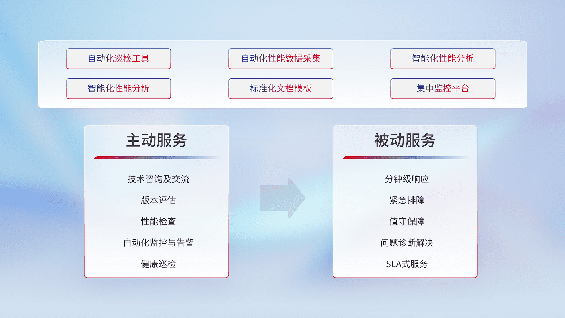 智能化工具和标准化文档,,,保障服务质量,,,提供主动服务(包含技术咨询、、版本评估、、、性能检查、、自动化监控与告警、、、、健康巡检)和被动服务包含(分钟级响应、、、、紧急排障、、、值守保障、、、、问题诊断解决、、SLA服务)。。。